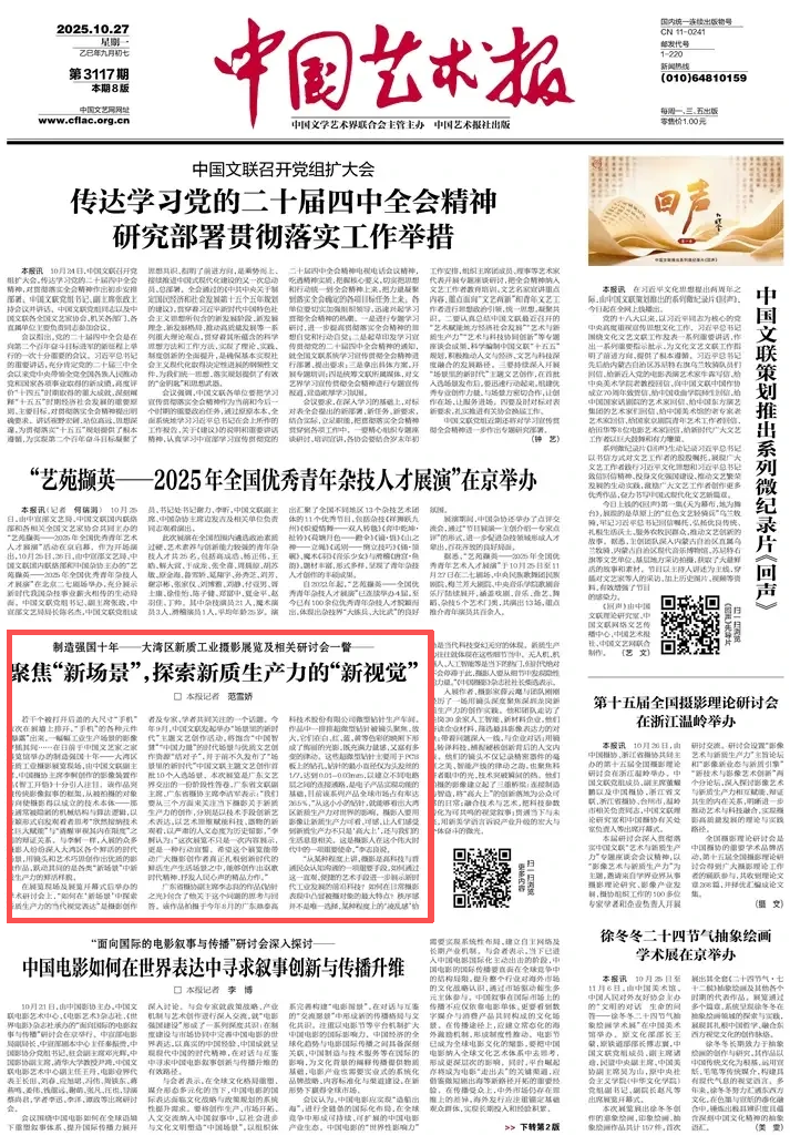 2025年10月27日出版的《中国艺术报》第一版“要闻”栏目刊发记者范雪娇署名文章《制造强国十年——大湾区新质工业摄影展览及相关研讨会一瞥——聚焦“新场景”,探索新质生产力的“新视觉”》。全文分享如下: