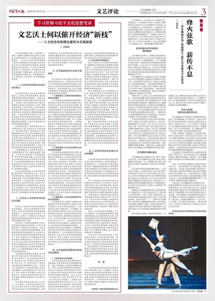 2025年9月15日出版的《中国艺术报》第三版“文艺评论”栏目刊发广东省文联古梁金署名文章《文艺沃土何以催开经济“新枝”——人文经济学的理论建构与实践探索》。全文分享如下: