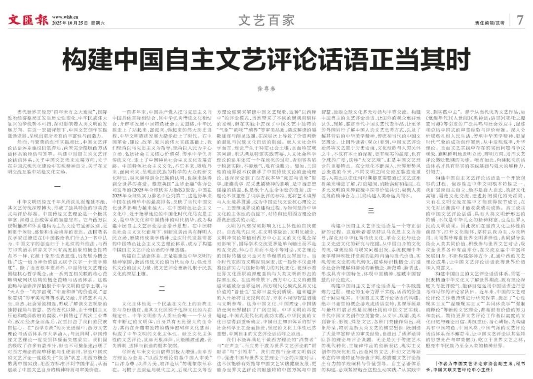 2025年10月25日出版的《文汇报》第7版“文艺百家”栏目刊发中国文艺评论家协会副主席、秘书长,中国文联文艺评论中心主任徐粤春署名文章《构建中国自主文艺评论话语正当其时》。全文分享如下: