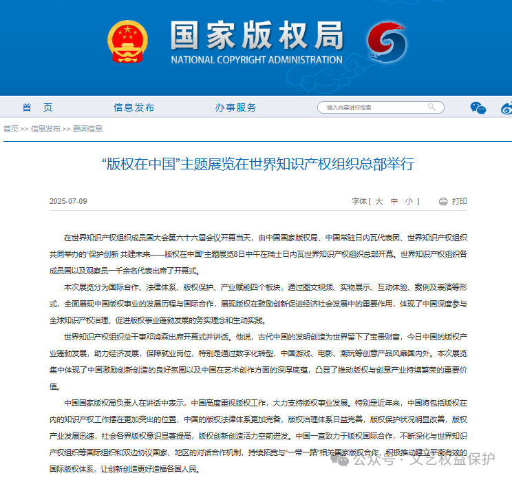 在世界知识产权组织成员国大会第六十六届会议开幕当天,由中国国家版权局、中国常驻日内瓦代表团、世界知识产权组织共同举办的“保护创新 共建未来——版权在中国”主题展览8日中午在瑞士日内瓦世界知识产权组织总部开幕。世界知识产权组织各成员国以及观察员一千余名代表出席了开幕式。