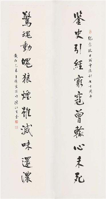 鉴史引经,穷寇曾输心未死;惊魂动魄,狼烟虽灭味还浓。 王伟宏 联(行书) 陈初生(广东省书协顾问)