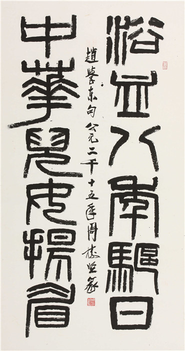 浴血八年驱日,中华儿女扬眉。 赵学东 句(篆书) 周树坚(广东省书协顾问)