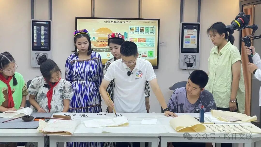 广东省对口支援新疆工作前方指挥部、广东省文联、新疆文联和喀什地区文联联合主办的“跨粤山海 奔赴疆来”庆祝中华人民共和国成立75周年主题快闪活动在喀什举办。广东省文艺志愿者在喀什市“悦读粤有趣”城市书吧举行“同写中国字、同画中国画和经典诵读”活动