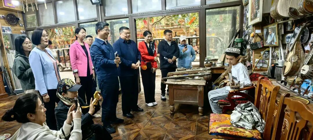 广东省文联党组书记、专职副主席王垂林一行在喀什古城调研,与喀什本土少数民族乐器传承人面对面交流,沉浸式感受弹布尔、都塔尔、热瓦甫等乐器背后的文化底蕴与艺术魅力