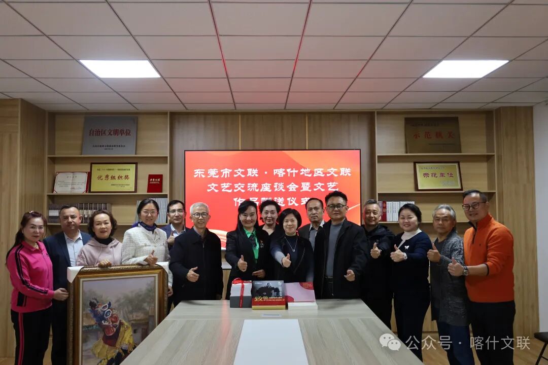 东莞市机关事务管理局副局长江祎霞(时任市文联党组成员、专职副主席)率艺术家赴喀什,与喀什地区文联相关同志及部分地区文艺家协会代表进行交流座谈,双方共同围绕文艺资源共享、活动联办、主题创作共创等展开了热烈交流探讨,江祎霞代表东莞市文联向喀什地区文联赠送了美术、摄影及文学作品