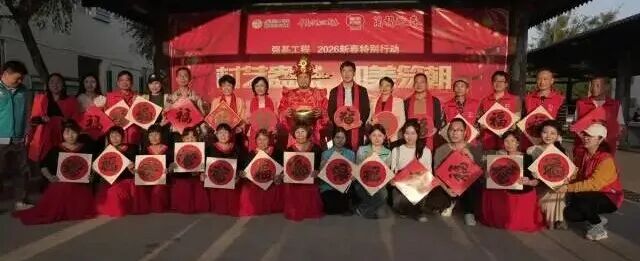 下午两点半,活动预热环节已热闹开场。“万福迎春”挥春惠民摊位前,书法志愿者们挥毫泼墨,将一副副满载祝福的春联送到乡亲们手中。