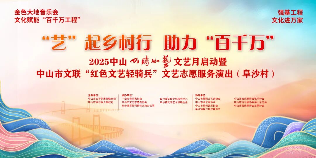为深入贯彻落实中山市委“百县千镇万村高质量发展工程”工作部署,浓墨重彩书写好“文化兴城”大文章,加快建设现代化人文精品城市,中山市文学艺术界联合会、中山市阜沙镇人民政府联合主办的“艺起乡村行 助力百千万”2025中山“四时如艺”文艺月启动暨中山市文联“红色文艺轻骑兵”文艺志愿服务演出活动,将于2025年11月7日晚在阜沙镇阜沙村举行。