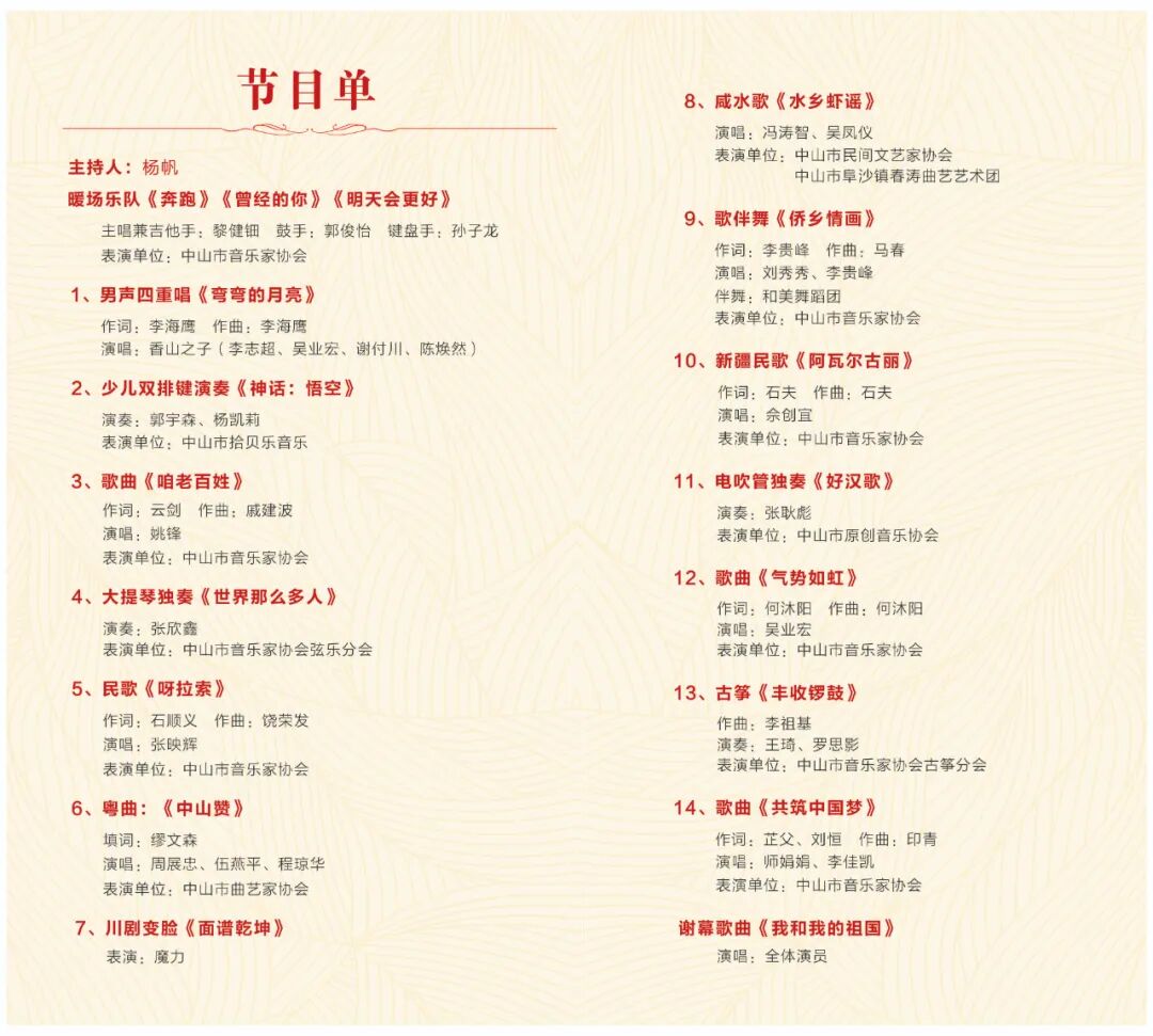 承办单位:中山市音乐家协会、中山市文艺志愿者协会、阜沙镇宣传和教体文旅办公室、阜沙镇宣传文化服务中心、阜沙镇文学艺术界联合会