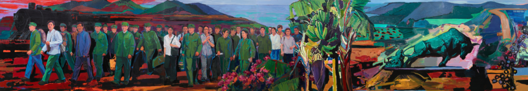 长卷的场景需要真实,创作中邀请深圳市委党史文献研究室专家逐帧推敲历史细节,但又要避免过度写实,在写实与写意之间取得平衡。长卷将城市宏大气魄、经典符号与细微个体三者有机融合,转化为可识别的油画元素,以艺术语言重构记忆。在两个相邻却有时间区隔的画面之间,艺术家巧妙加入现代抽象数字语言,如芭蕉、荔枝树等岭南植物和方格、线条等抽象语言,成为两个画面之间跳转的接口,实现传统中国画起承转合的韵律与油画的表现力有机统一。长卷将历史与现实、艺术与真实、微观与宏观进行编织、熔铸,表达出艺术家的主观感受与精神理想,演绎出深圳人文城市的壮美乐章,绘就一部荡气回肠的视觉史诗。