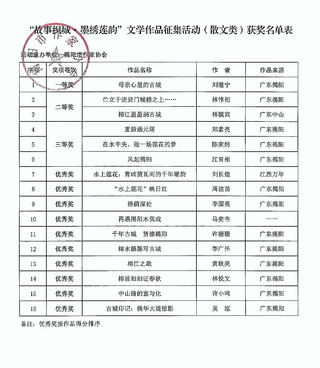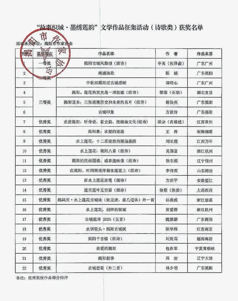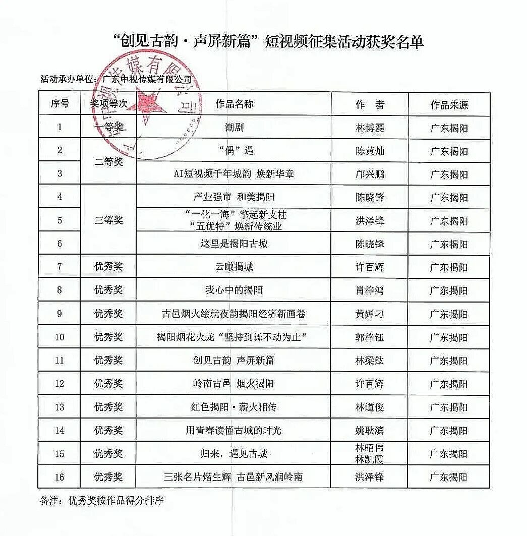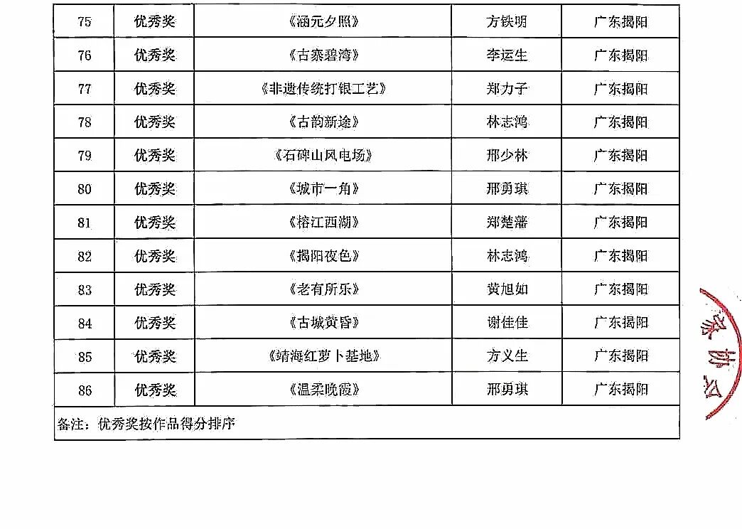 由广东省文联、揭阳市委宣传部指导,揭阳市文联主办,相关艺术家团体或单位承办的“千年城韵·焕新华章”——揭阳“讲好古城故事 发掘文艺精品”系列活动,自2025年8月启动以来,共收到海内外来稿5237件(组),经整理初筛、集中复评、专家合议、公证公示等程序,共评出477件(组)优秀作品。其中,一等奖10名、二等奖20名、三等奖30名、优秀奖417名(名单详见附件)。