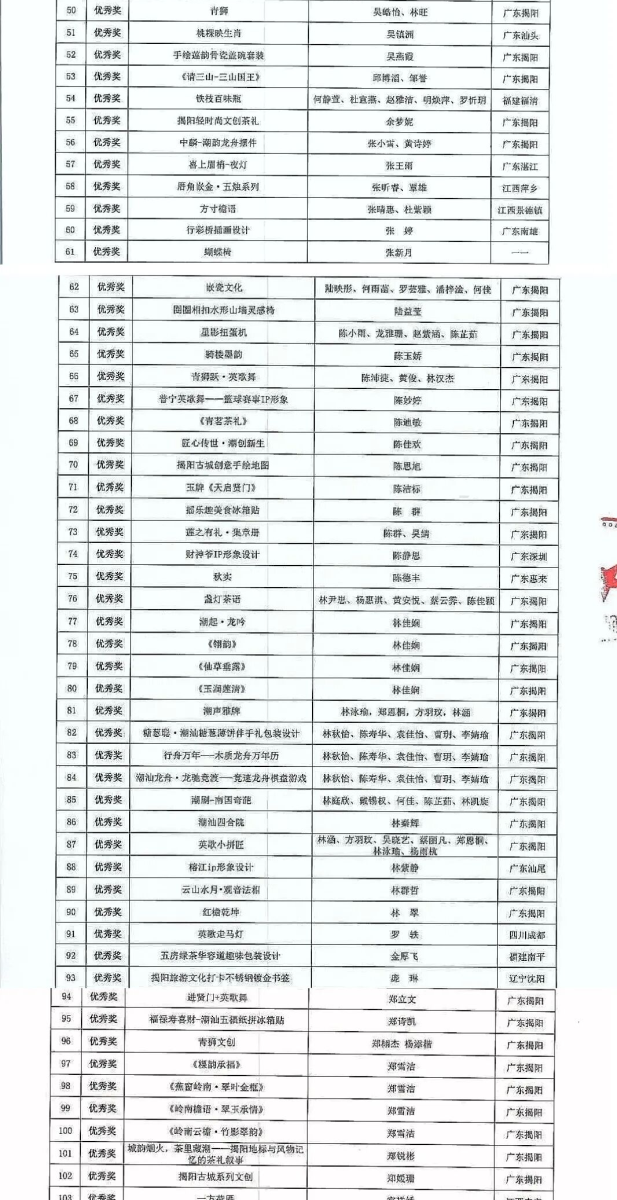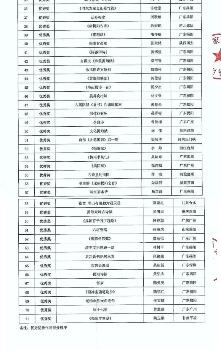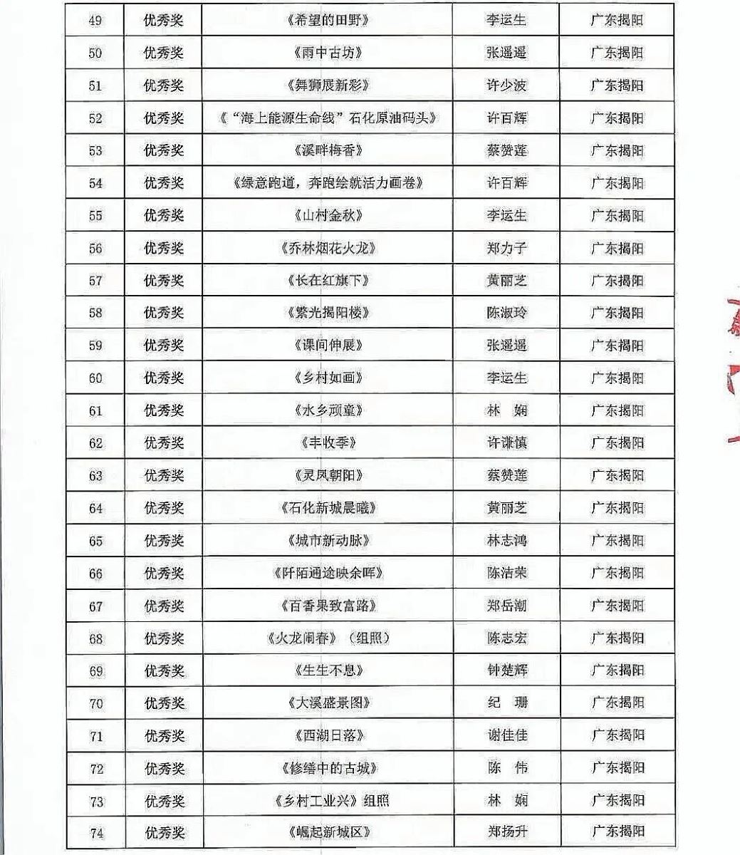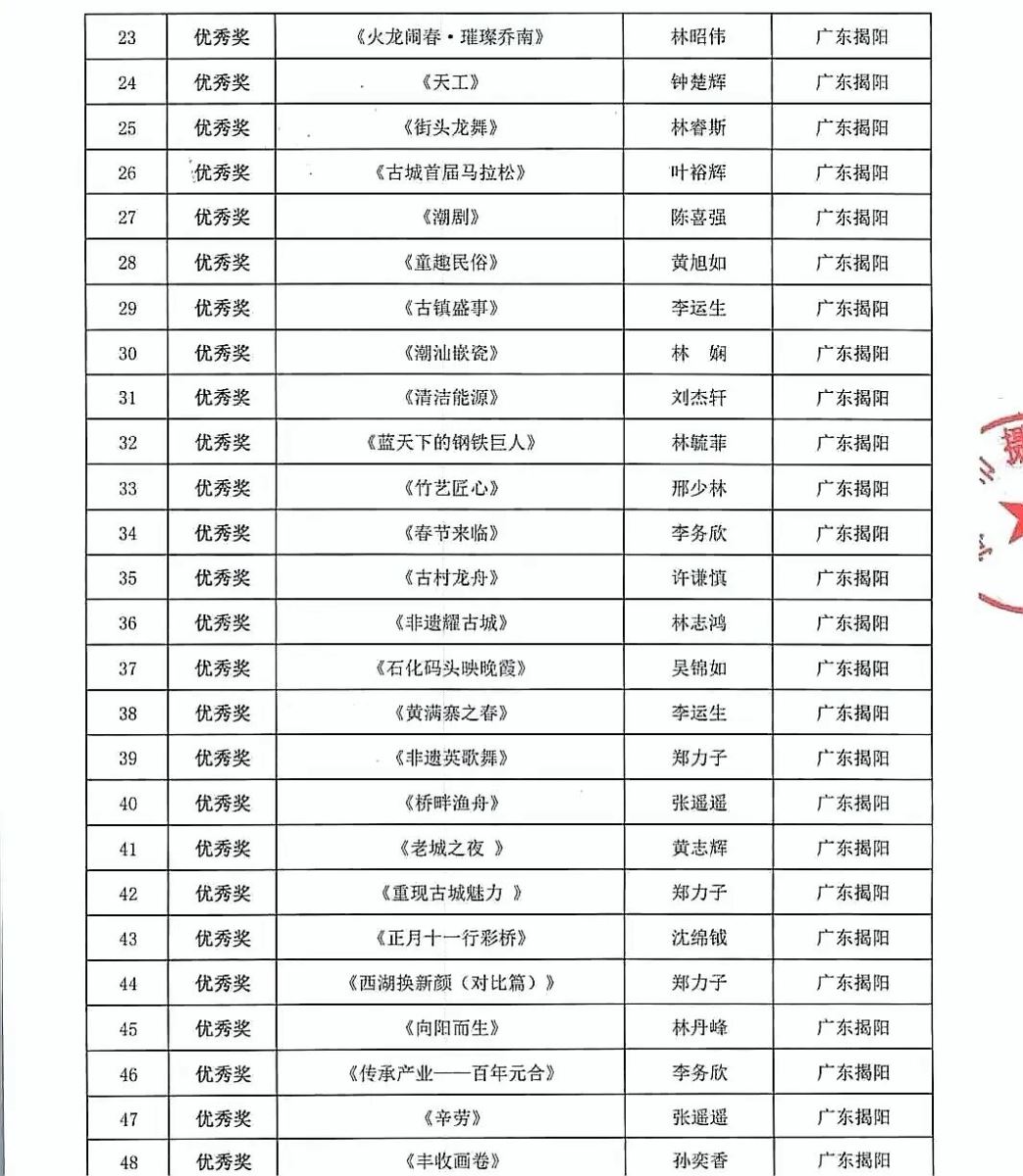 由广东省文联、揭阳市委宣传部指导,揭阳市文联主办,相关艺术家团体或单位承办的“千年城韵·焕新华章”——揭阳“讲好古城故事 发掘文艺精品”系列活动,自2025年8月启动以来,共收到海内外来稿5237件(组),经整理初筛、集中复评、专家合议、公证公示等程序,共评出477件(组)优秀作品。其中,一等奖10名、二等奖20名、三等奖30名、优秀奖417名(名单详见附件)。