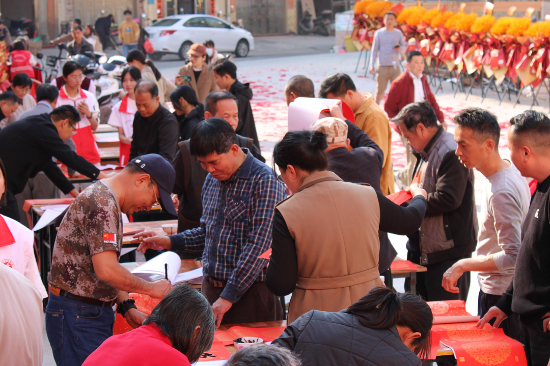 为弘扬中华优秀传统文化,营造欢乐祥和、温馨喜庆的节日氛围,1月21日,广东省书法家协会、肇庆市书法家协会、德庆县文联受凤村镇党委政府和驻凤村镇帮镇扶村工作队邀请组织省市县镇村书法家,在德庆县凤村镇和古杏村开展“万福迎春”公益活动,为群众义务书写春联、送祝福。广东省书法家协会秘书长李菲鸿,广东省文艺志愿者协会副主席黄健生,肇庆市书法家协会主席李刚,省书协副秘书长、肇庆市书协副主席于瑞欢,肇庆市书协副主席莫启华,德庆县美术书法协会常务副会长谈成辉,副会长谈金清,监事长陆华,理事陈炳新等共9位书法艺术家以及凤村镇书法爱好者参加了“万福迎春”活动。此次活动不仅是对传统文化的传承与弘扬,更是以文化赋能乡村振兴,助力“百千万工程”高质量发展的具体实践。