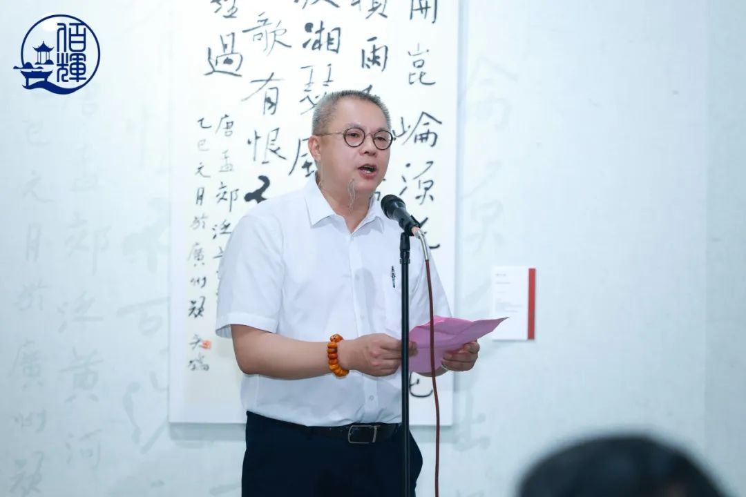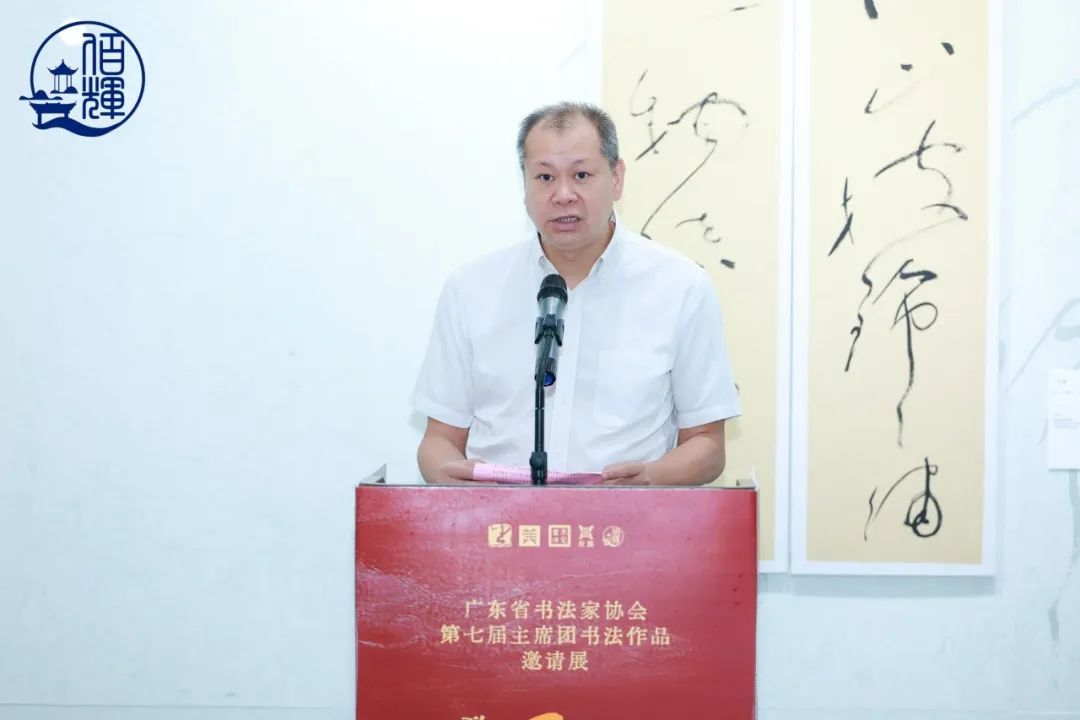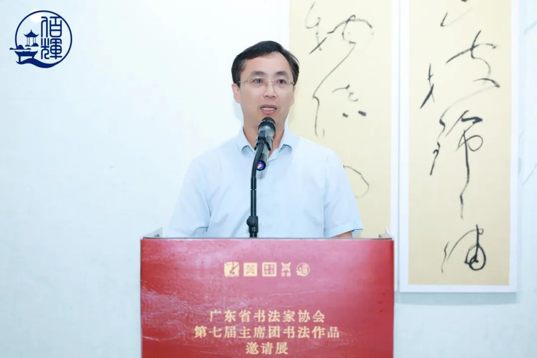 高景海表示,本次展览的26件精心创作的书法作品,凝聚了广东省书协主席团成员的艺术智慧与人文情怀。我们以笔墨为媒,既展现岭南文脉的厚重底蕴——山水共情、民俗流芳,也书写新时代劳动者的奋斗赞歌——锐意进取、开拓创新,生动诠释了文艺工作者“深入生活、扎根人民”的创作导向。高景海感谢佰辉书院的大力支持并宣布展览开幕。