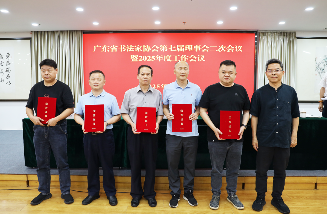 会议传达学习了中宣部等十部门联合印发《新时代职业道德建设实施纲要》、中国书协2025年度工作会议及职业道德与行风建设委员会工作会议精神、省文联深入贯彻中央八项规定精神学习教育工作部署会和全面从严治党工作会议精神,简要通报了2024年省书协主要工作情况和2025年重点工作计划,宣读了《中国书法家协会关于表彰2025年两节期间“万福迎春”公益活动先进单位和先进个人的决定》《2024年中国书协理事会理事履职考核优秀名单》《广东省书法家协会关于表彰2025年两节期间“万福迎春”公益活动先进单位和先进个人的决定》,王垂林为获得中国书法家协会、广东省书法家协会2025年两节期间“万福迎春”公益活动先进单位颁发了证书。