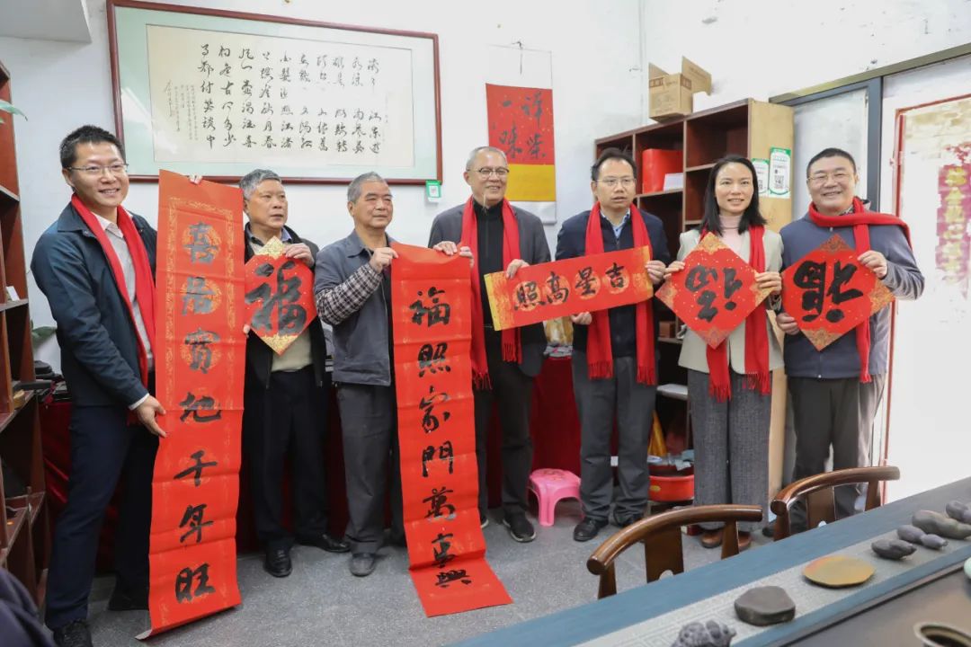 1月3日,由广东省书法家协会、肇庆市文联、肇庆学院工会主办,肇庆市书法家协会、高要区文联、高要区金渡镇人民政府承办的“万福迎春”公益惠民活动在金渡镇水口社区举行。省文联美书摄工作部主任、省书法家协会专职副主席颜奕端,肇庆市委宣传部副部长、市新闻出版局(市版权局)局长张嘉,肇庆市文联党组书记、主席程彦春,肇庆市高要区委常委、宣传部部长赵一虎,肇庆市书法家协会主席李刚等参加活动,并与书法家们一同走进社区群众家中送“福”字、送春联,提前为群众送上新春的祝福。