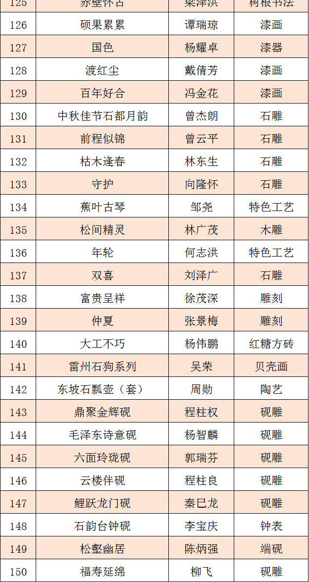 日前,由广东省文学艺术界联合会、广州市文学艺术界联合会、广东省民间文艺家协会和广东省工艺美术协会主办的“第十五届广东省民间工艺精品展”完成初评工作。本届展览共收到327件参评作品,经评选共200件作品入选终评,现将结果公布公示如下: