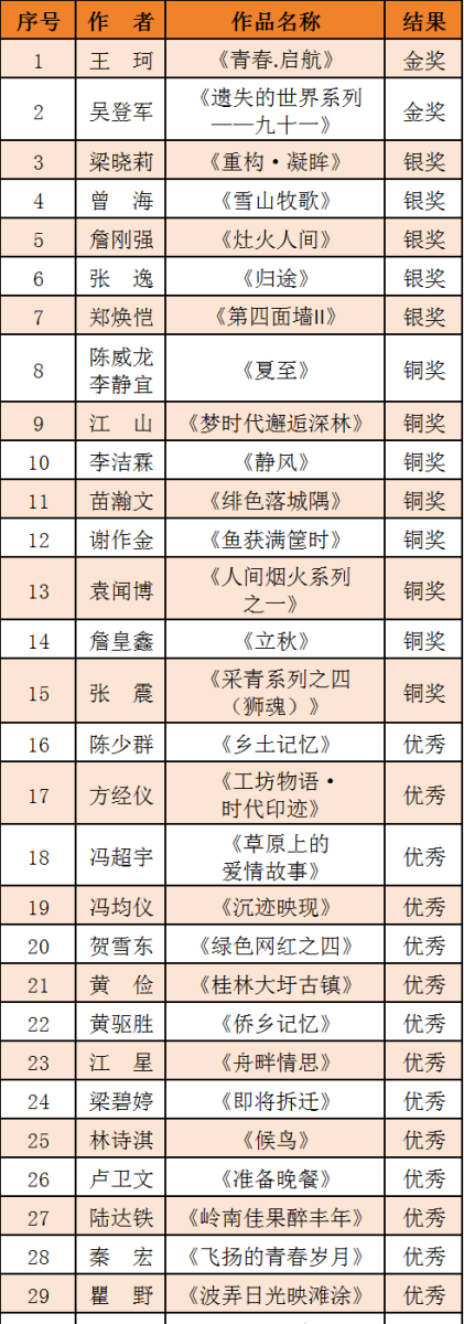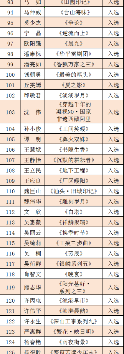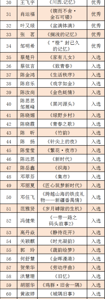 由广东省美术家协会、中共梅州市委宣传部、梅州嘉应学院联合主办的“广东省第十一届水彩、粉画展”复评工作于2025年12月27日在梅州嘉应学院举行。经评审,共有156件作品入选,其中金奖2件、银奖5件、铜奖8件、优秀奖19件。现将复评结果公布。