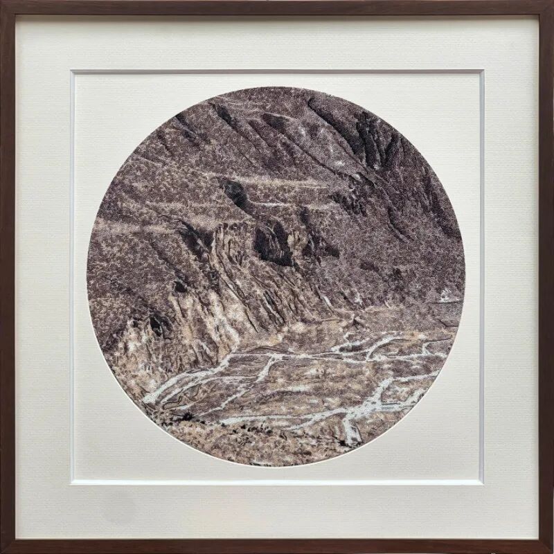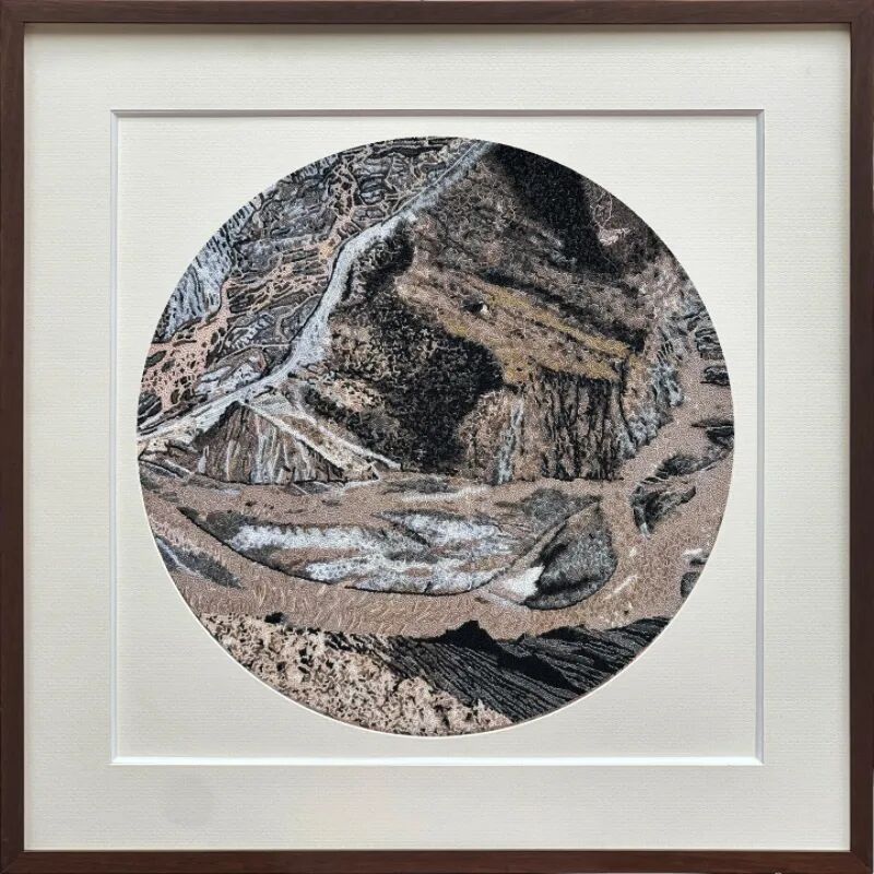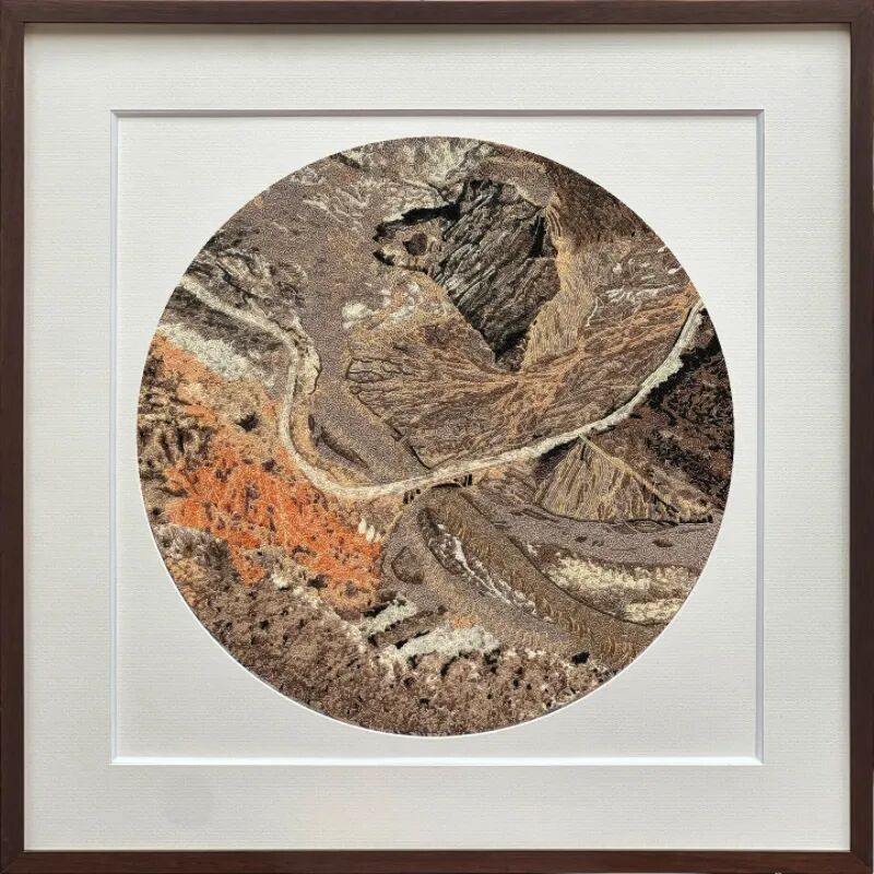 作品试图捕捉的是大峡谷瞬息万变的光影与永恒的沉静之间的张力。峡谷深处的色彩如同被时光雕刻过一般,层叠、沉稳,却在光线掠过时迸发出意想不到的辉煌。珠绣的折射与微光,使画面既具岩壁的质感,又仿佛藏着自然能量的脉动。观者可在珠面中感受到峡谷的幽深、风化的痕迹,以及光从缝隙中照入时的那份神秘与蓬勃。