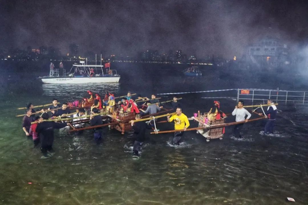 元宵节当晚,湛江市坡头区麻斜罗侯王庙会海上游神,当地居民抬着“神轿”走入海中