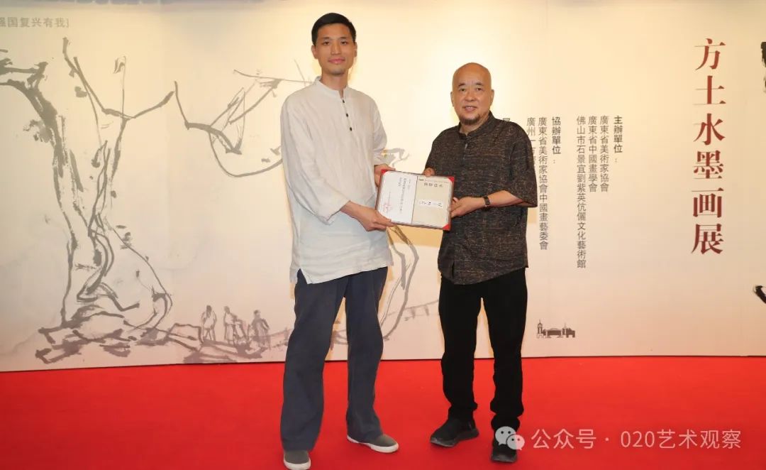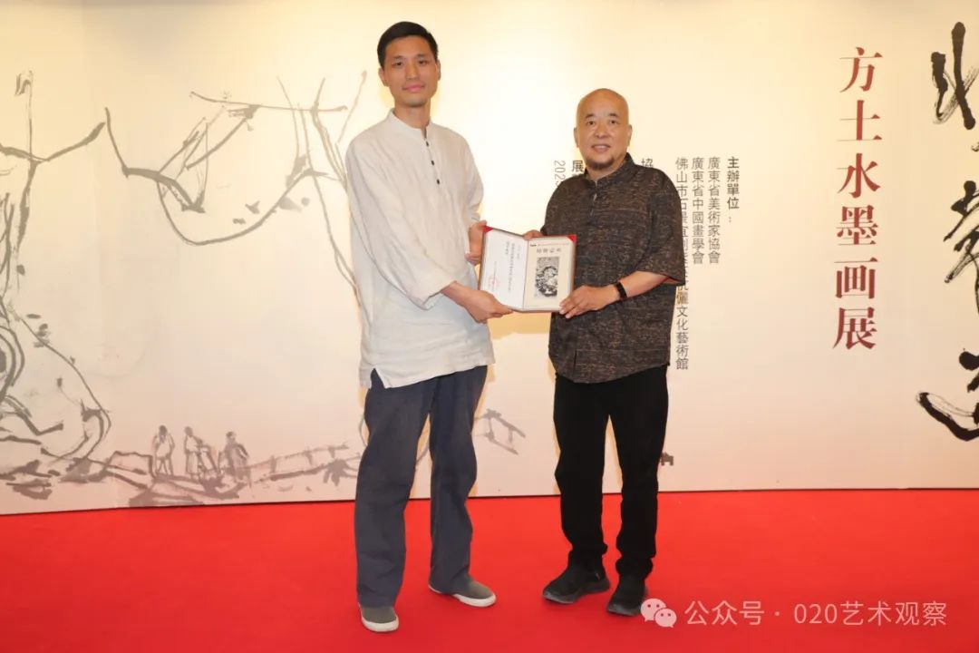 方土向佛山市石景宜艺术馆捐赠书法《游心方外》,佛山市石景宜艺术馆副馆长邱健彬(左)代表艺术馆接受捐赠并向方土颁发捐赠证书