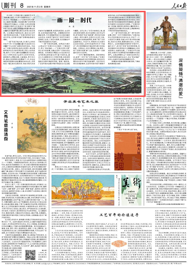 2025年11月02日出版的《人民日报》第08版副刊发表中国美术家协会副主席、广东省美术家协会主席林蓝署名文章《一画一展一时代》。文章以广东百年美术为脉络,通过“一画”、“一展”、“一时代”三个维度,介绍了正在上海美术馆热展的“其命惟新--广东美术百年大展”,系统阐述了广东美术在传承中创新、在对话中开拓的发展历程与革新精神。