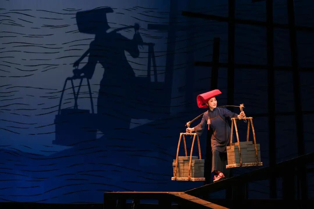 整个舞台设计极具想象空间,是一个打破又融合的立体世界——变幻的水线,是远渡重洋的波涛,也是思乡的泪水与汗水;压抑的船底舱,是她们颠沛流离的起点,也隐喻着生活的重负;而那逐渐升起的新加坡城市天际线,则是她们用青春与血汗一砖一瓦参与建设的见证。还有那一抹清冷的蓝色月光,静静洒在舞台上,注视着“红头巾”们在无数个夜晚把对亲人的思念默默咽下,又转化为第二天继续奋斗的勇气。这月光,照过新加坡的海面,也照过三水三江汇流的故乡水。