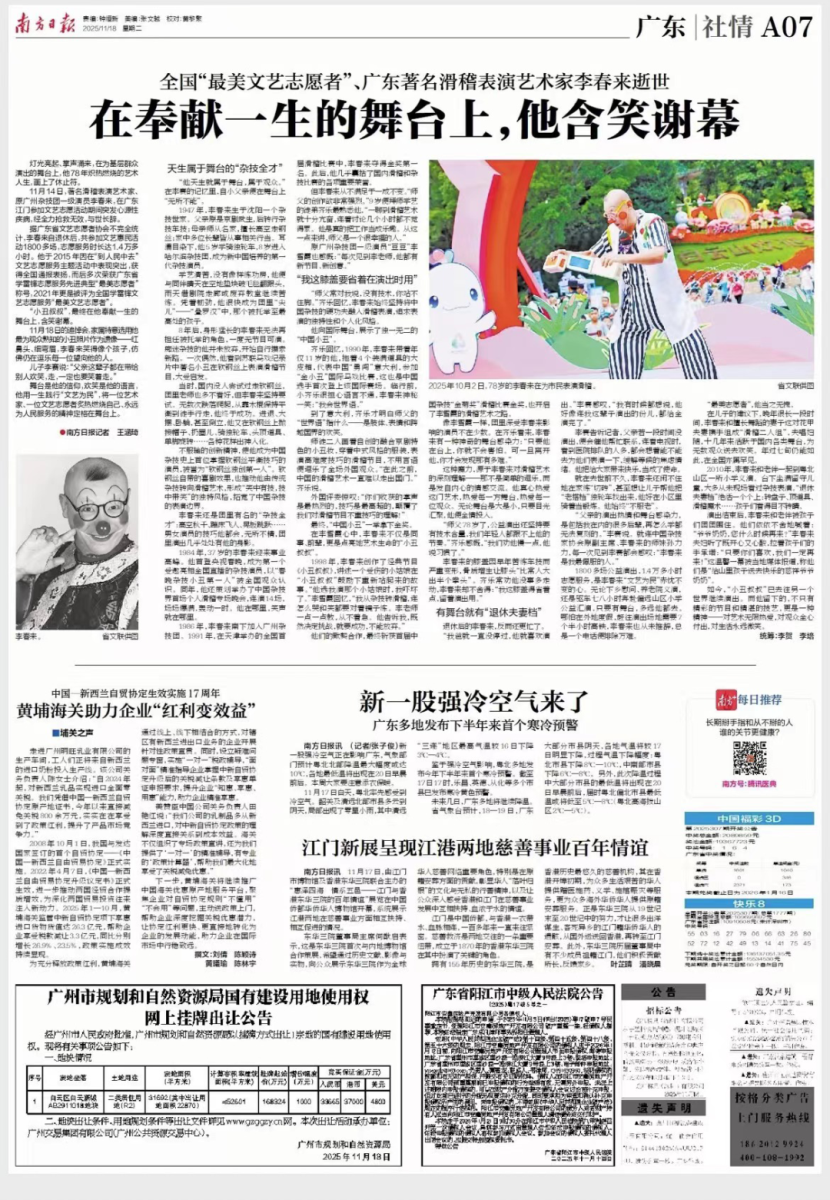 2025年11月14日,著名滑稽表演艺术家李春来,在广东江门参加文艺志愿活动期间突发心源性疾病,经全力抢救无效离世。11月18日,李春来同志追悼会在广州市银河园举行,同日出版的《南方日报》A07版社情栏目刊发悼念文章《一代“小丑叔叔”,在欢笑与掌声中谢幕》。