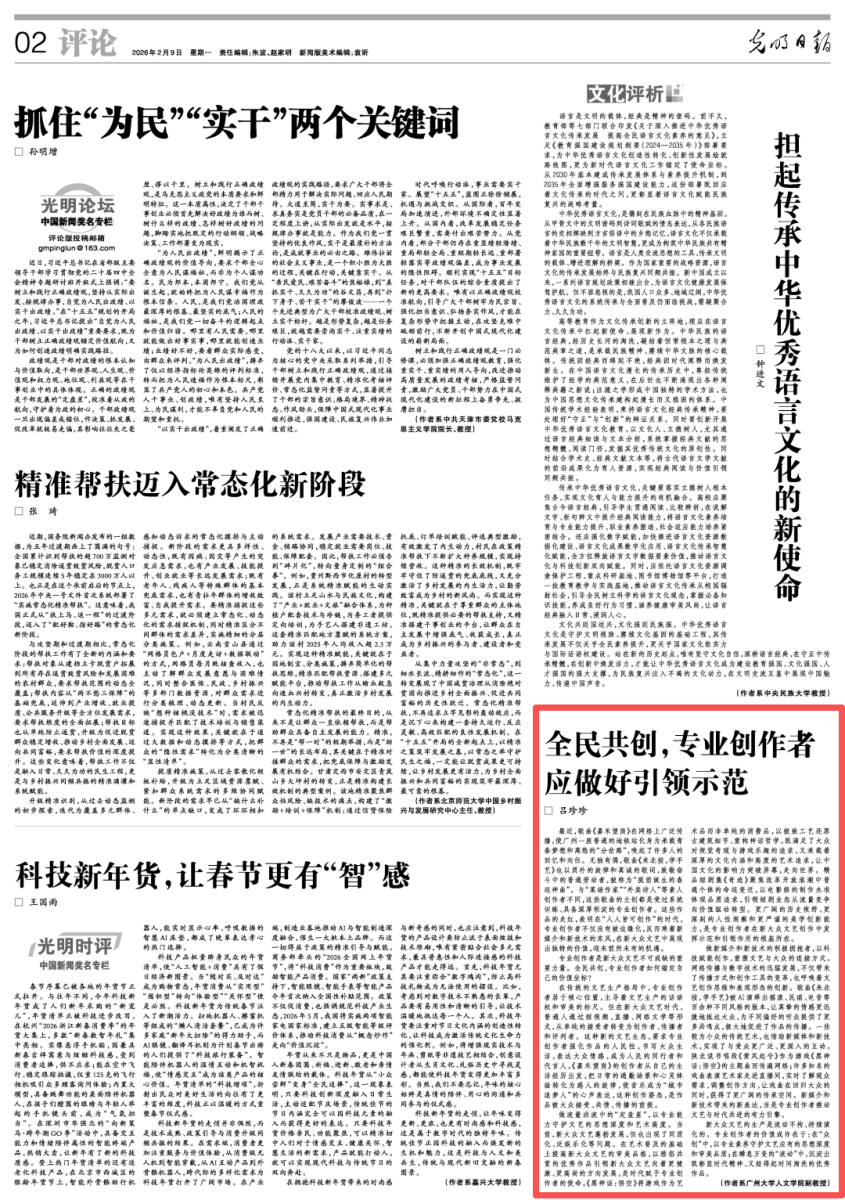 2026年2月9日出版的《光明日报》评论02版刊发广州大学人文学院副教授吕珍珍署名文章《全民共创,专业创作者应做好引领示范》,文章讲述新大众文艺时代,专业创作者不可或缺,需扎根大众、坚守专业、拥抱新媒介新技术,以专业素养沉淀优质时代作品。全文如下: