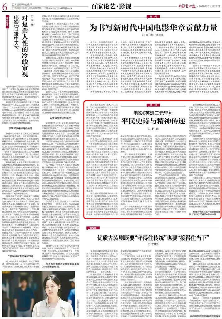 2025年11月24日出版的《中国艺术报》第06版百家论艺·影视专版刊发中国文艺评论家协会理事、广东省文艺评论家协会副主席、广州市文艺评论家协会主席罗丽的评论文章《电影〈英雄三元里〉:平民史诗与精神传递》。全文分享如下: