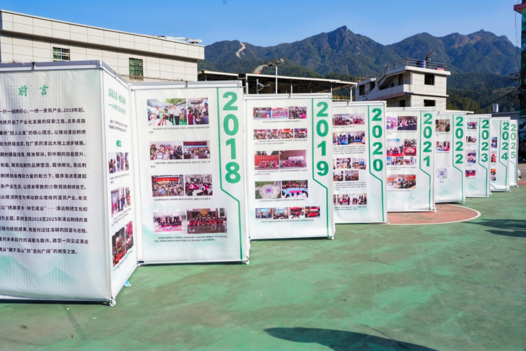 “绣美瑶乡·种艺成业——瑶绣‘输血→造血’转型纪实展”展出108幅精美刺绣作品。依托清远全省最多的刺绣艺人资源(90%绣娘生活在农村山区),清远市文艺志愿者协会深耕七余年,通过“授人以渔”模式孵化绣娘创业,助力她们足不出户增收致富,推动刺绣产业初具规模。展厅现场,绣娘代表与嘉宾共话技艺传承里的民生温度。