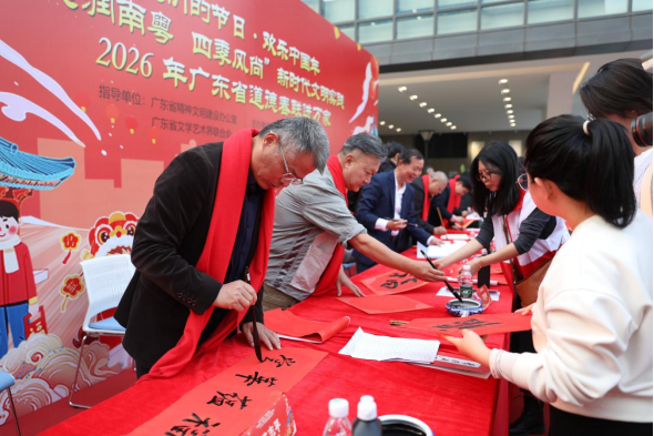 现场还同步启动了“德润南粤 四季风尚”新时代文明实践2026年广东省道德春联进万家活动。该活动由省文明办、省文联指导,省文艺志愿者协会主办,省书法家现场为群众免费书写春联、创作画作。
