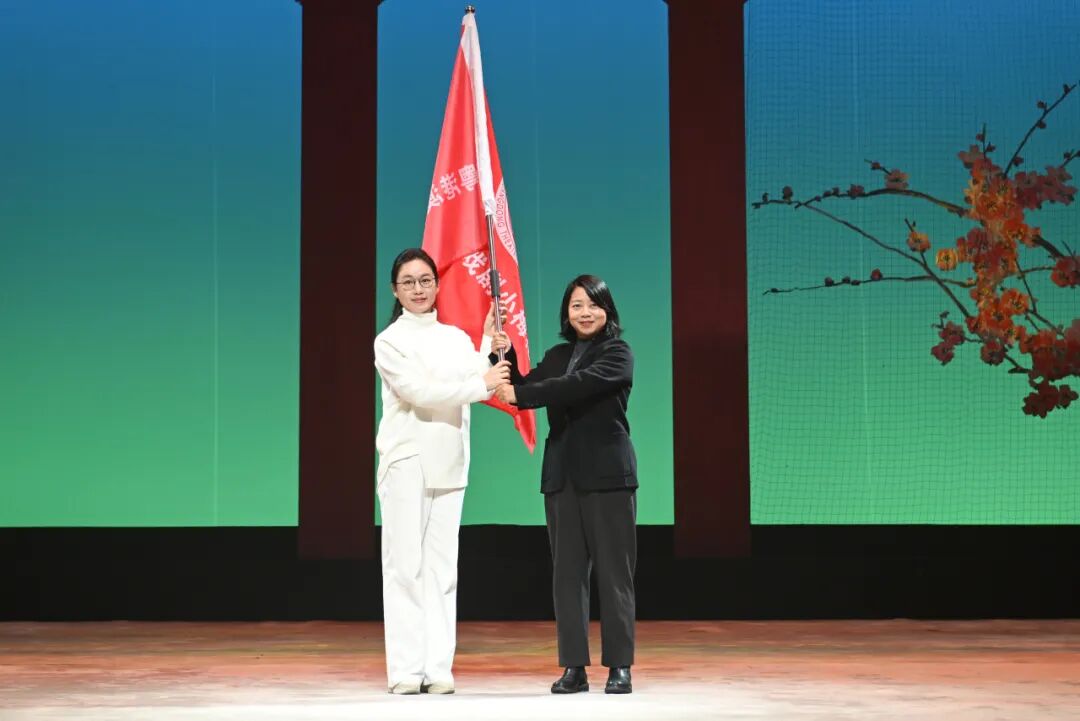 在展演晚会现场,象征着责任与传承的授旗仪式成为全场焦点。第三届粤港澳少儿戏剧小梅花荟萃将于2026年5月在珠海市高新区举办,曾小敏主席亲手将“粤港澳少儿戏剧小梅花荟萃”旗帜交接给珠海市高新区管委会副主任杨筱。旗帜交接的瞬间,既是使命的传递,更是希望的启航,预示着粤港澳大湾区少儿戏剧事业将在接力中蓬勃发展、薪火永续。