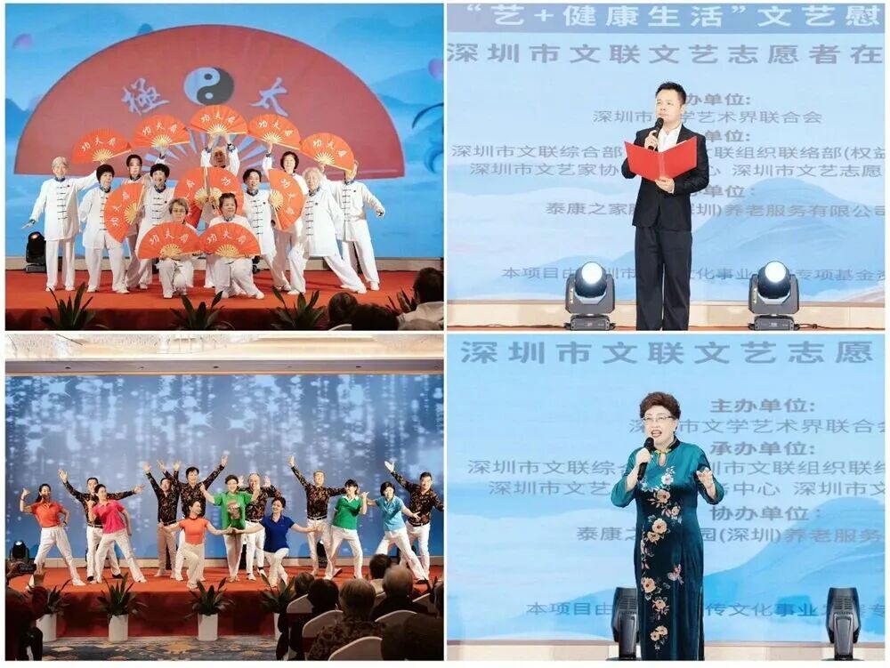 “艺+健康生活”板块的养老社区专场演出,彰显了文艺志愿服务的“温度”与“精度”,其核心突破在于从“送文化”到“送关怀”的价值升维。在大鹏新区泰康之家,舞蹈《倍儿开心》的欢快节奏、朗诵《对衰老的回答》的深情告白、互动点歌环节的乡音共鸣,构建起多层次的情感交流场景。不同于传统慰问演出的“单向输出”,这场活动特别设计了长者自发表演的环节,《中华太极扇》的整齐招式不仅展现“老有所乐”的精神风貌,更让老年群体从“观众”转变为“参与者”,实现了文艺服务的双向互动。