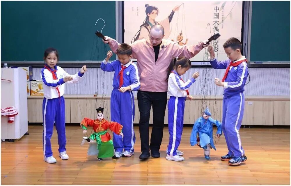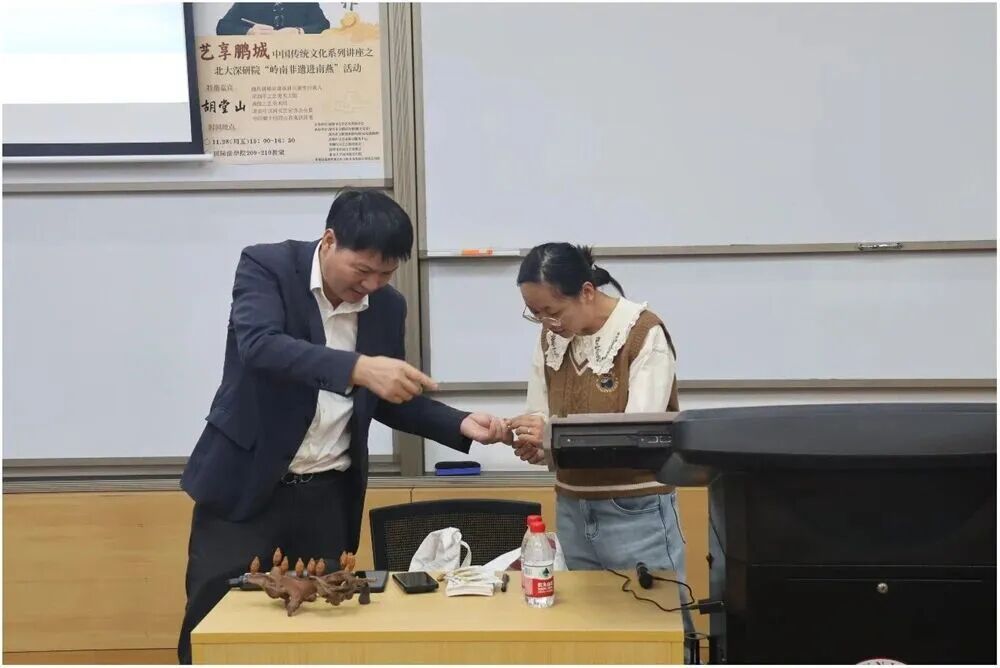 “艺+欢乐市民”板块的6场传统文化讲座,核心并非简单的“非遗展示”,而是实现传统艺术与当代生活的深度对话,让文化遗产从“博物馆展品” 转变为“可感知、可运用的生活资源”。青年木偶表演艺术家蔡佳捷在荔园小学的讲座中既带来精彩纷呈的木偶戏与皮影戏展演,又详解木偶制作材料的独特质感、提线木偶关节的灵活构造,亲自指导学生上台体验提线木偶与布袋木偶的操控技巧,通过知识性与趣味性兼具的互动讲解,将非遗传承与青少年美育深度融合,播下文化自信的种子;谢氏核雕传承人胡堂山在北大深研院分享“5分钟解析核雕核心”,与在校生问答互动,现场传艺,让匠心“于方寸之间”与当代青年形成共鸣。